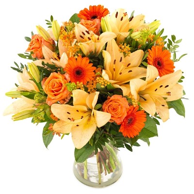 Haal de nazomer binnen met deze nostalgische mix van rozen, germini's en lelies. Dit bonte boeket wordt omzoomd door seizoensgroen en fleurt elke herfstige dag weer op!